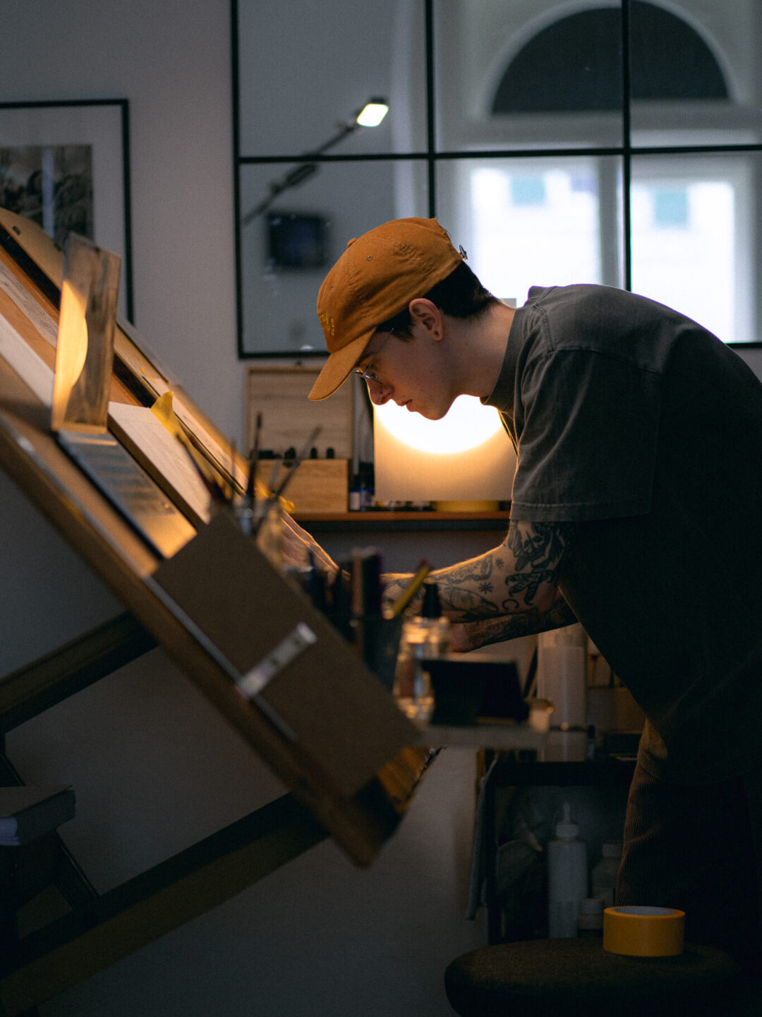 Active since 2018, his work is rooted in realism with a tendency towards melancholic themes and surreal elements. Although predominantly traditional, some of his paintings incorporate a mixed media approach utilizing digital tools. Kept mostly monochromatic, the images often depict a subject-centered composition with an emphasis on emotions and body language. The paintings are done by layering hundreds of translucent acrylic washes atop each other to build contrast. David has grown very fond of this time intensive process and values it for its meditative qualities.